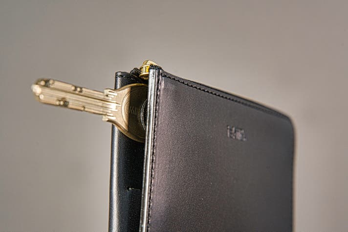 マチのデッドスペースを生かして格納され、鍵の存在感はなくミニマル財布としての装い。