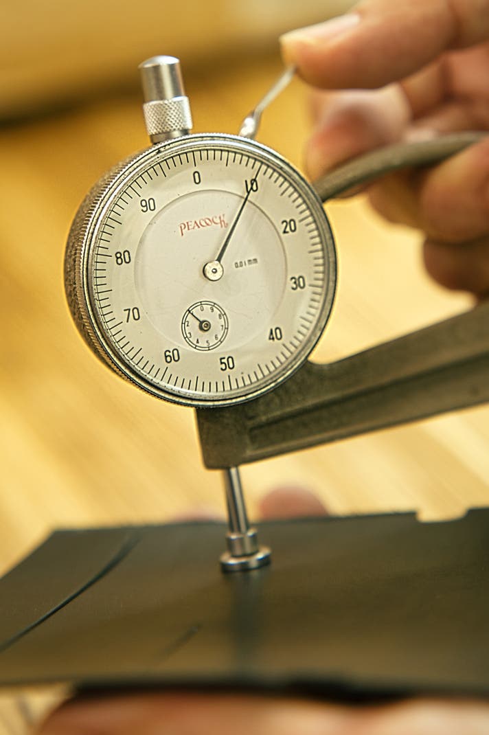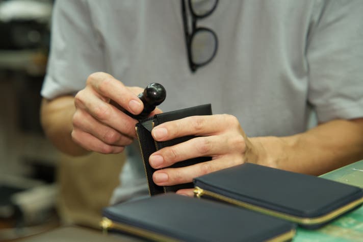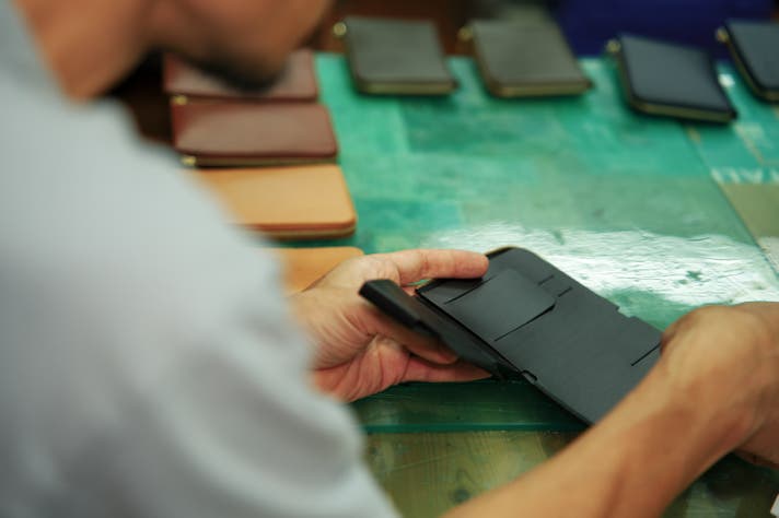 イタリアンレザーを知り尽くした技術で、コバ磨きから細部に至るまで丹念に仕上げ、5回以上の試作を経て限界まで薄い設計を実現。