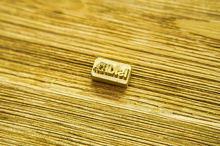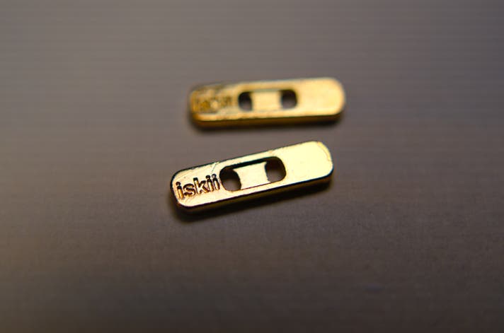 鍵のホールドに使われるゴールド金具は、iskiiのロゴが刻印された特注品。鍵とエラスティックコードの厚みを抑えるため特殊形状で設計しました。