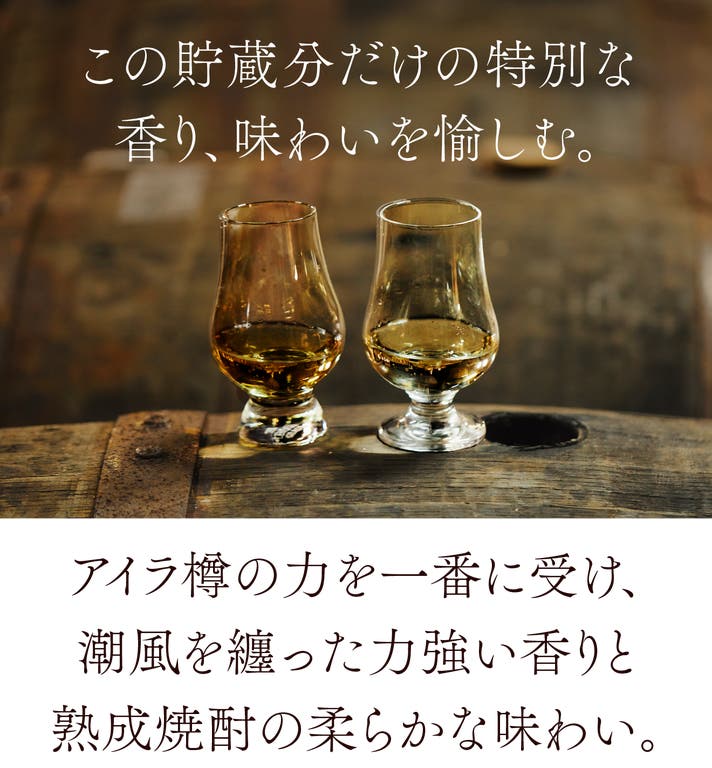 鹿児島最古の焼酎蔵で醸された「長期熟成焼酎」に、アイラカスクの個性がダイレクトに混ざりあうことで、スコッチウイスキー特有の力強い香りを持ちながら熟成焼酎の柔らかな味わいがバランスよく調和しています。