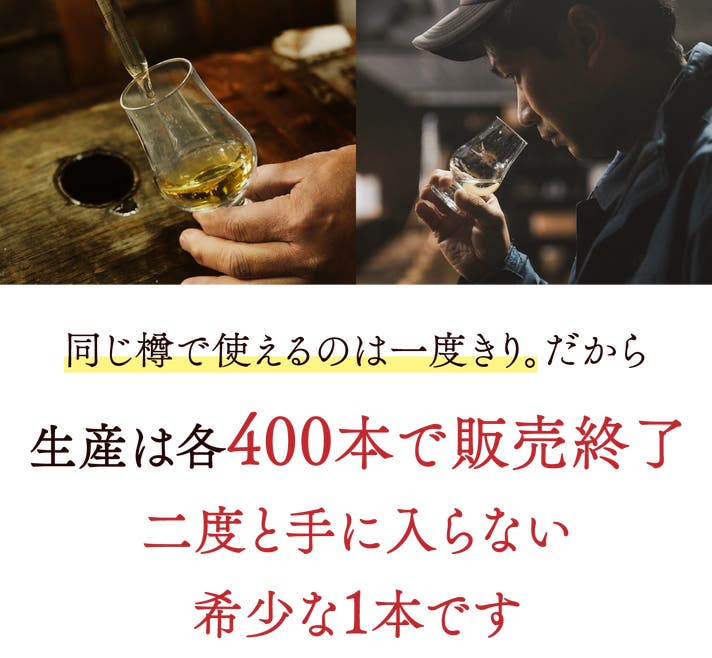 カスクの個性をもっとも色濃く感じることができる「ファーストフィル」。今回、アイラの樽で追熟した原酒をそのまま味わっていただくために、Makuake用に400本限定生産を行います。最良の環境にあった一樽から出したままの原酒をお楽しみいただけます。