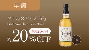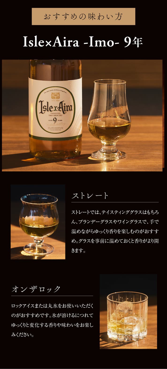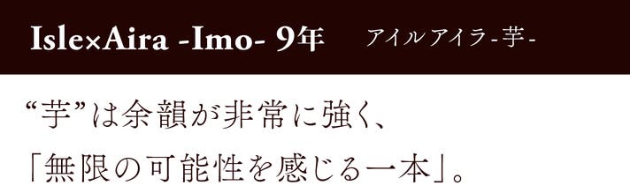 9年熟成された芋焼酎を、ウイスキーの仕込みに使われていたアイラ島のカスクで追熟。原酒となる芋焼酎は、従来より米麹を多く使用した「1:3仕込み」と呼ばれる特殊な仕込み方法で造られています。米の華やかな甘みが引き出された熟成焼酎とアイラ島カスクの個性が濃厚に混ざりあった印象的な味わいです。