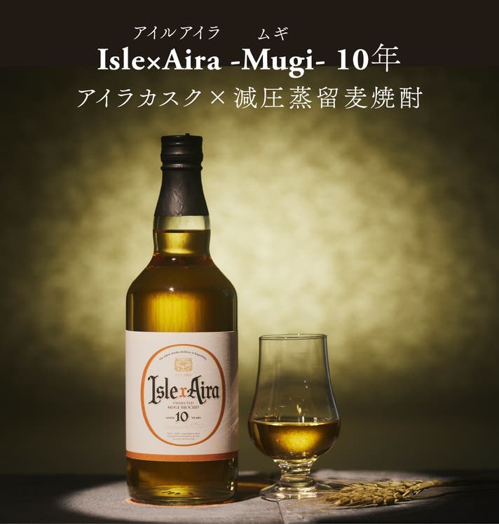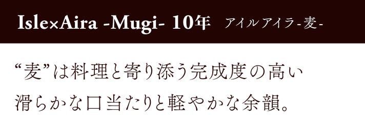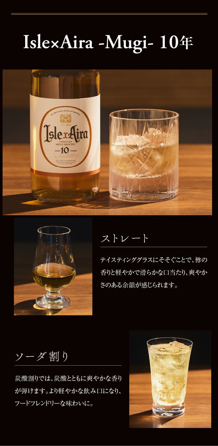 10年熟成させた麦焼酎を、ウイスキーの仕込みに使われていたアイラ島カスクで追熟。 減圧蒸留で造られた麦焼酎ならではの軽やかで透明感のある香りを残しつつ、しっかりとしたカスクの薫香・味わいも引き継いだ一本です。