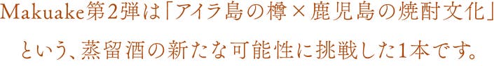 「Makuake(マクアケ)」は、実行者の想いを応援購入によって実現するアタラシイものやサービスのプラットフォームです。このページは、 フードカテゴリの 「アイラ樽の香りを纏う。鹿児島最古の蔵が挑む、一度きりの長期熟成焼酎。芋・麦2種」プロジェクト詳細ページです。