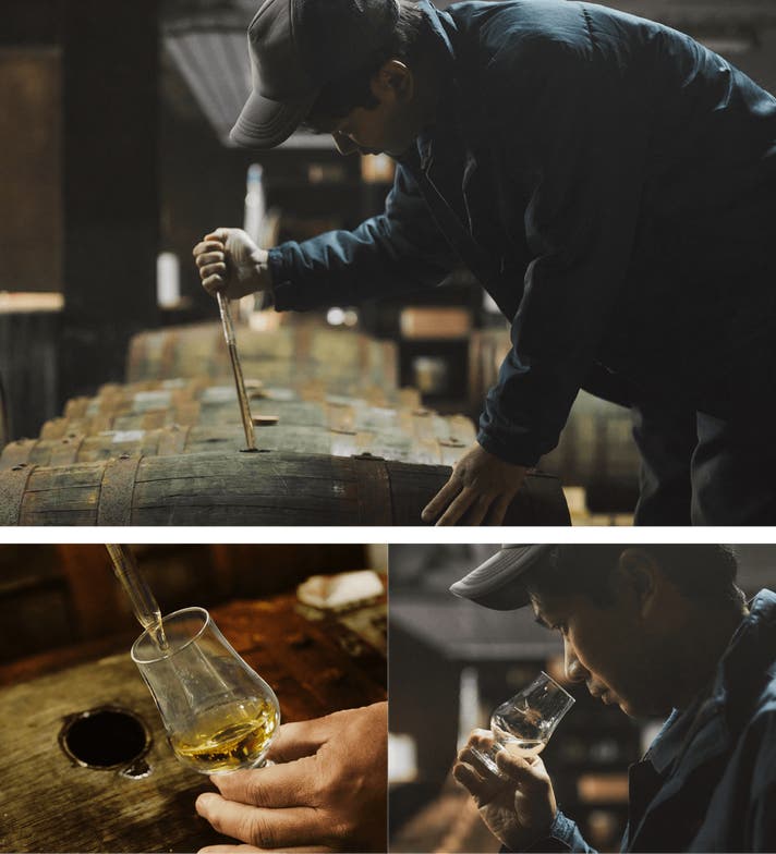 強い個性をもつアイラ樽と熟成焼酎をバランスよく調和させるためには熟練した職人の感覚が必要不可欠です。それぞれの香り、味わいがもっとも引き立つ組み合わせを見極め、新たな味わいを生み出すために日々向き合っています。