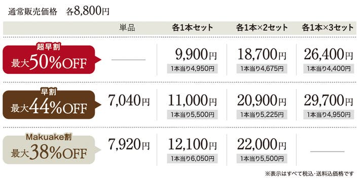 早期ご購入へのお礼の気持ちをこめて、通常価格のほかに「超早割」「早割」「Makuake割」をご用意いたしました。