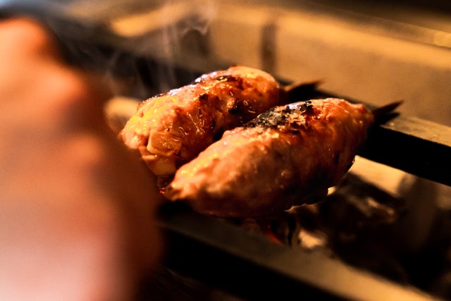 ラム特有の臭みのないジューシーなアニョドレを使ったつくね串は、濃厚な味がたまらない名古屋コーチンの卵黄ソースと、つくね串に合わせてブレンドしたシェフ特製の自家製黒七味でお召し上がりください。