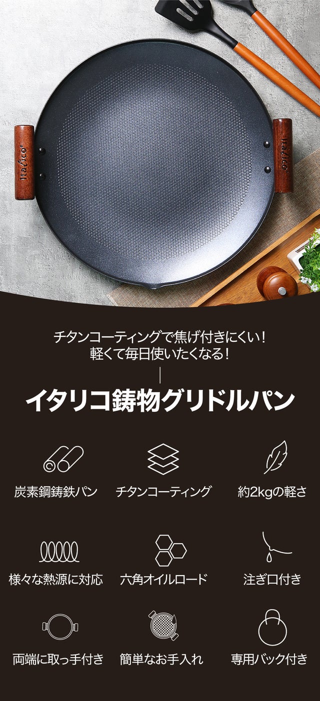 イタリコの鋳物グリドルは内外装に5重チタンコーティングを施しました。