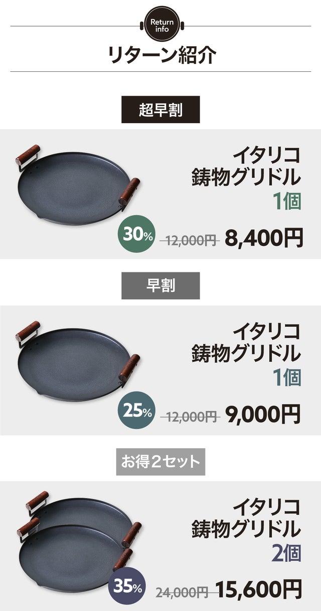 リターン品の配送が完了するまで、弊社はイタリコの日本における独占販売権を有する正規代理店です。詳細に関しては、ページ下部のリスク&チャレンジをご確認ください。