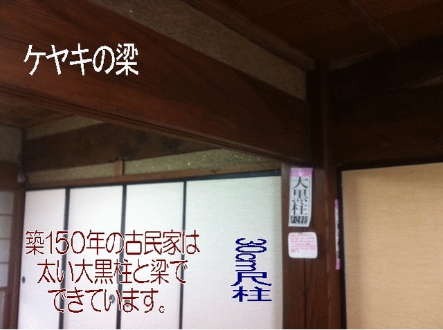 太い大黒柱と、ケヤキの梁の立派な古民家です。