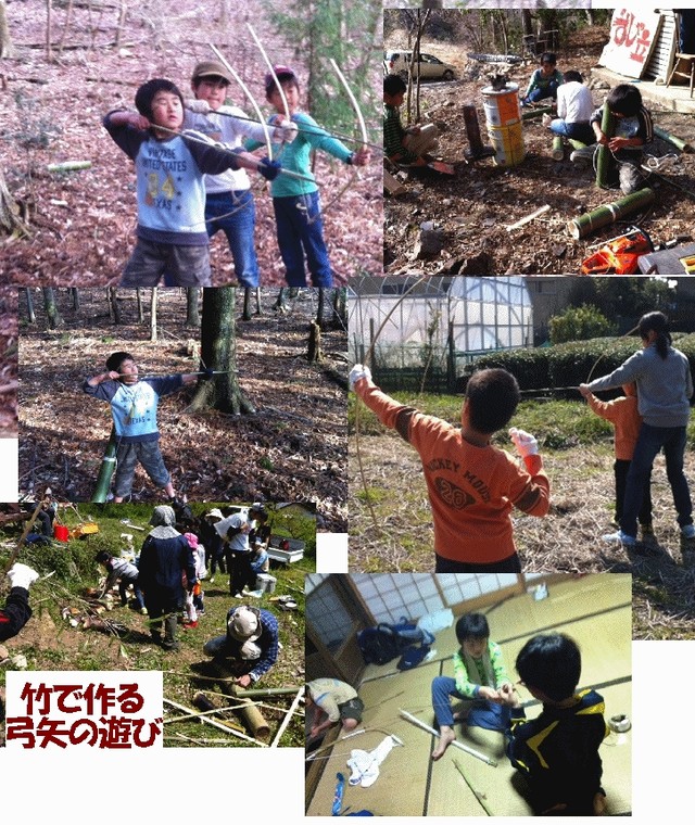 丸子の谷間も放棄竹林が広がっていきます。そこで環境教育を合わせて活動をしています。竹林の整備からタケノコ堀、そして竹を素材にして道具を作っています。写真では子供たちに弓矢の作り方を教えて安全に遊び方を伝えています。子供はずっと工作しています。いろいろなものが竹から作れて遊べるので、どんどん遊んで欲しいと願っています。