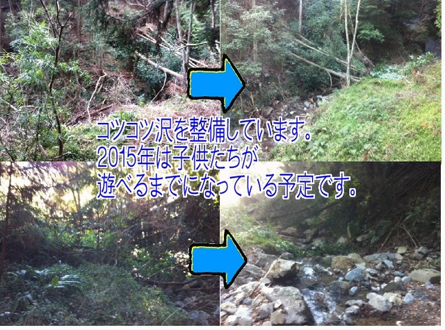 沢を整備して、風倒木を片付けて広場を作っています。森を整備して子供たちが遊べる空間をコツコツ作ってきました。