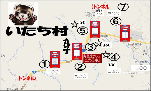 実際にいたち村に訪れる時には、可能ならば国道一号線バイパスでやってきてください。国道一号線バイパスでは、丸子字赤目ケ谷の谷間はそれぞれ東西に2kmほどの長さのトンネルで挟まれています。そのトンネル間の、山に囲まれる空間が丸子いたち村です。新鮮な気分でトンネルを抜けたら日常と別世界が在ることになります。