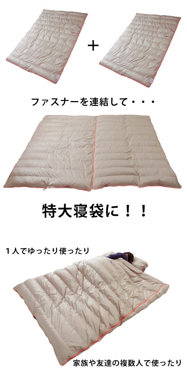 当商品2枚を両サイドのファスナーを連結させると、ご家族用で一緒に使えるワイドサイズの寝袋になります。