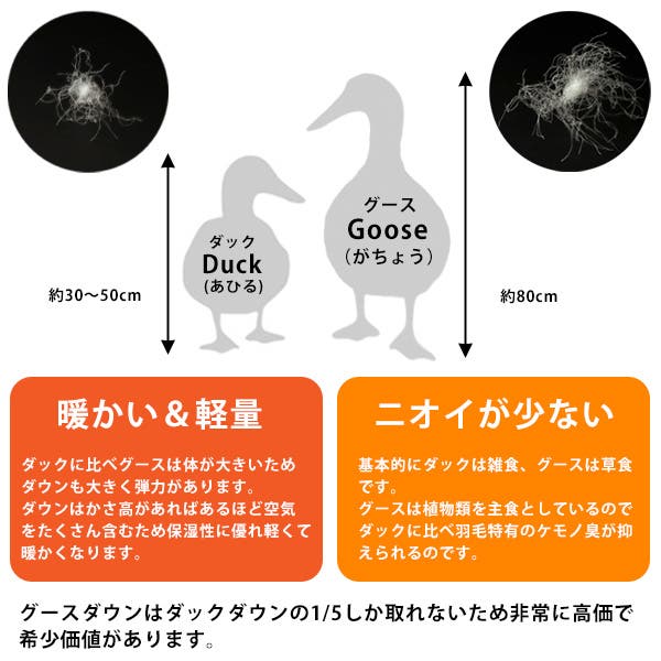 また、今回使用しているグース(がちょう)は、ダック(あひる)よりも体が大きい=ダウンが大きいためより暖かくなります。