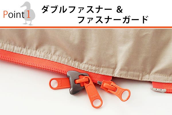 内側からでも着脱簡単なダブルファスナー。生地の噛み込み防止のファスナーガードが付いています。