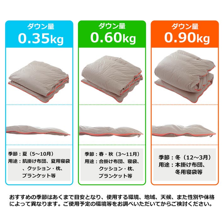 「夏にも使えたら…」「もう少しボリュームがあったら嬉しい」などのお声をいただき、今回3種類のボリュームの羽毛布団をご用意しました。