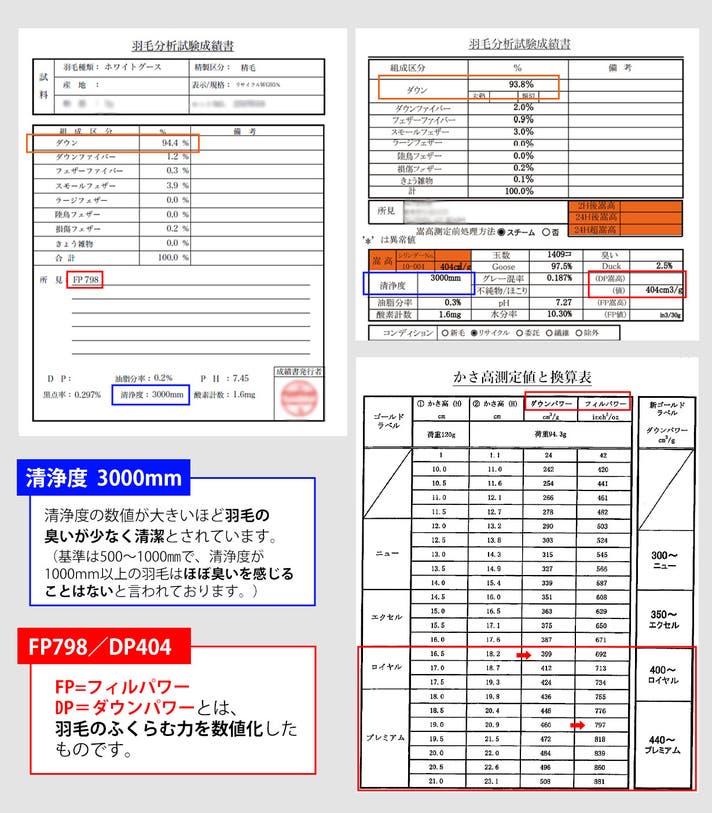 自社従来品の羽毛製品の清浄度はだいたい1000mm以上ですが、今回のリターンの羽毛布団は清浄度3000mm以上になります。