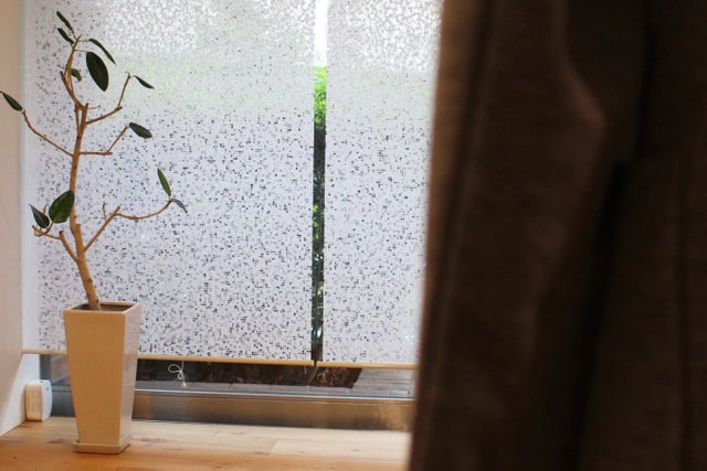 「糸落水ロールスクリーン」は和紙にあえてムラを作ることで不規則で自然な穴があいています。このムラが外側と内側の空間を曖昧に優しく仕切り、人と人との距離感を良好に保ちます。