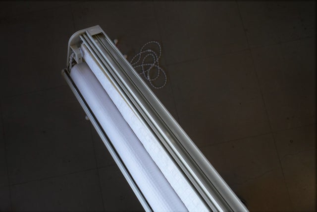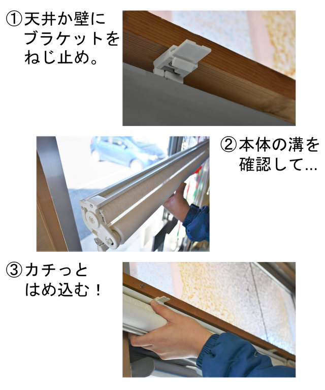 取り付け方は通常のロールスクリーンやブラインドと変わりません。天井に水平に取り付けることも、壁に垂直に取り付けることも可能です。