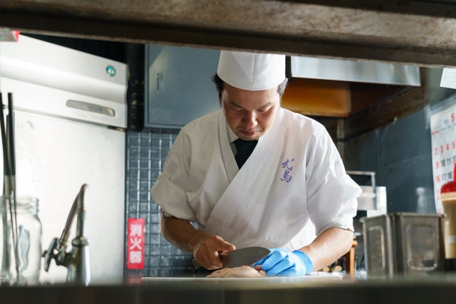 内臓もすべてついた新鮮な状態で運ばれた名古屋コーチンは、店内の職人によってさばかれます。