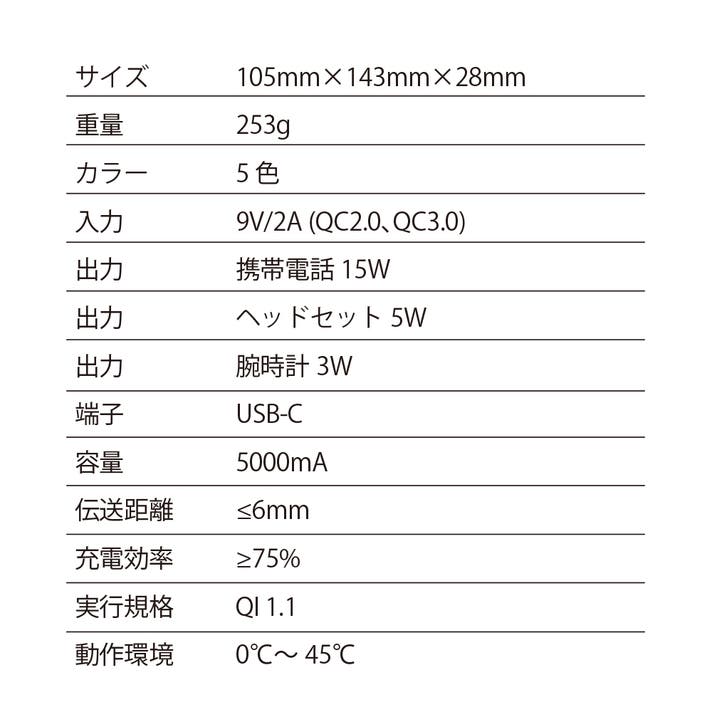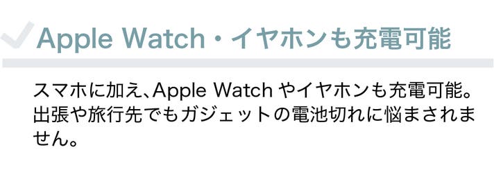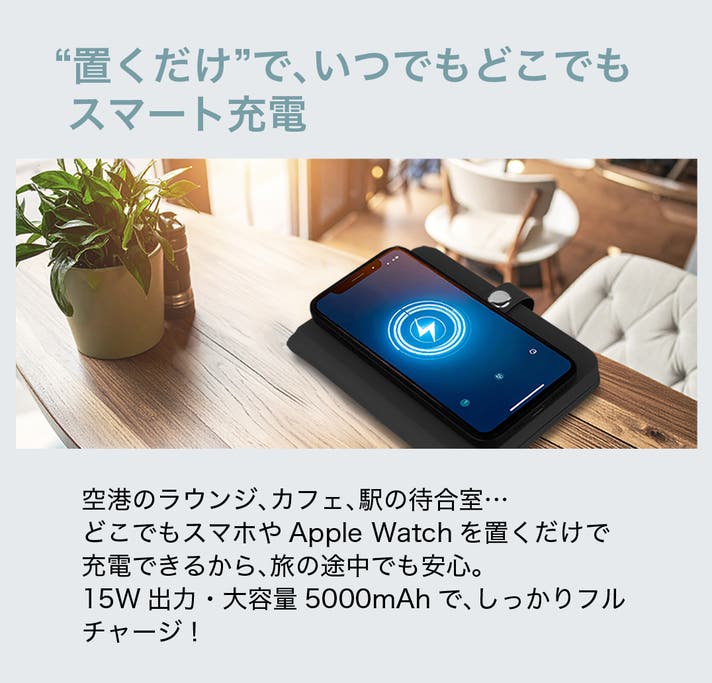 本製品はスマートフォン(15W)に加え、イヤホン(5W)、Apple Watch(3W)の充電が可能です。