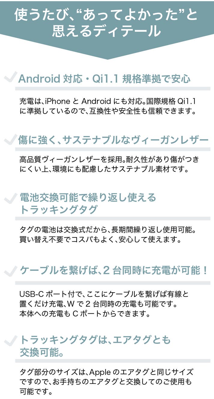 A. 本製品はAppleの「探す」ネットワーク(Find My)を利用しており、iOS/iPadOS/macOSユーザーに最適化されています。Androidユーザーの方はトラッキング機能をご利用いただけませんのでご了承ください。