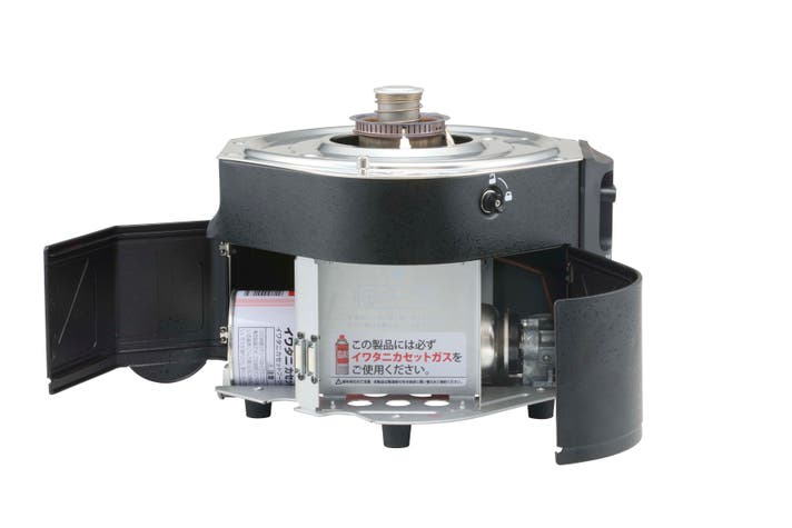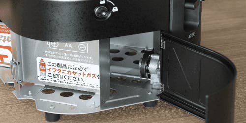 ①前扉、後ろ扉を開けてカセットガスを装着します。