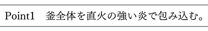 強力な炎が釜全体を包み込みます。それによりお米の一粒一粒をムラなく加熱し一気に炊き上げます。「一気に炊き上げる」だからこそ、粘りと甘みを最大限に引き出します。