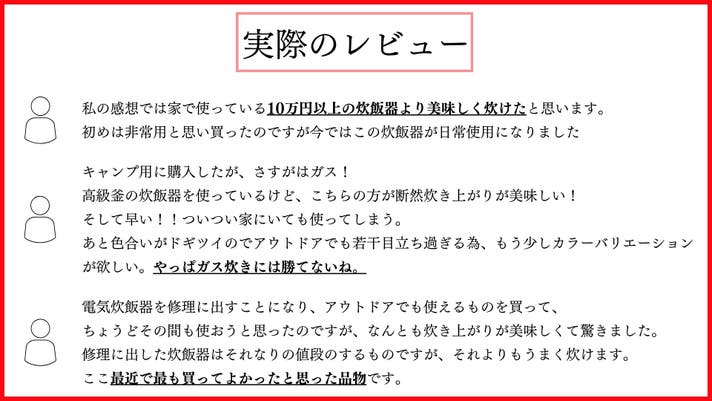 - 直火だから早い。5合のごはんでも釜内沸騰まで13分、炊飯時間は18分。(気温25℃のとき)