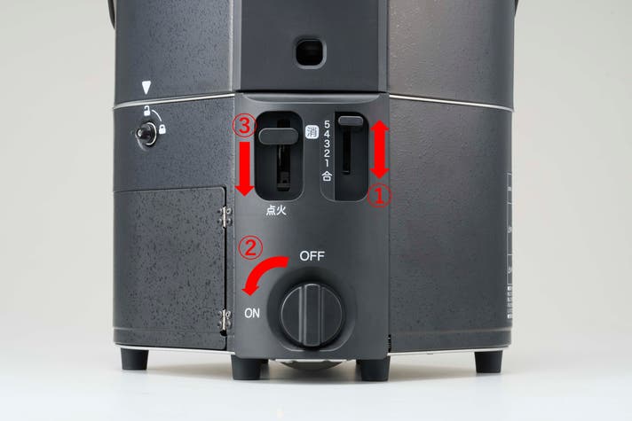 ①火力調節レバーとお米の分量に合わせ、②器具栓つまみをONに合わせ、③点火レバーを押し下げるだけ。以上です。火加減の調整なども行う必要はありません。