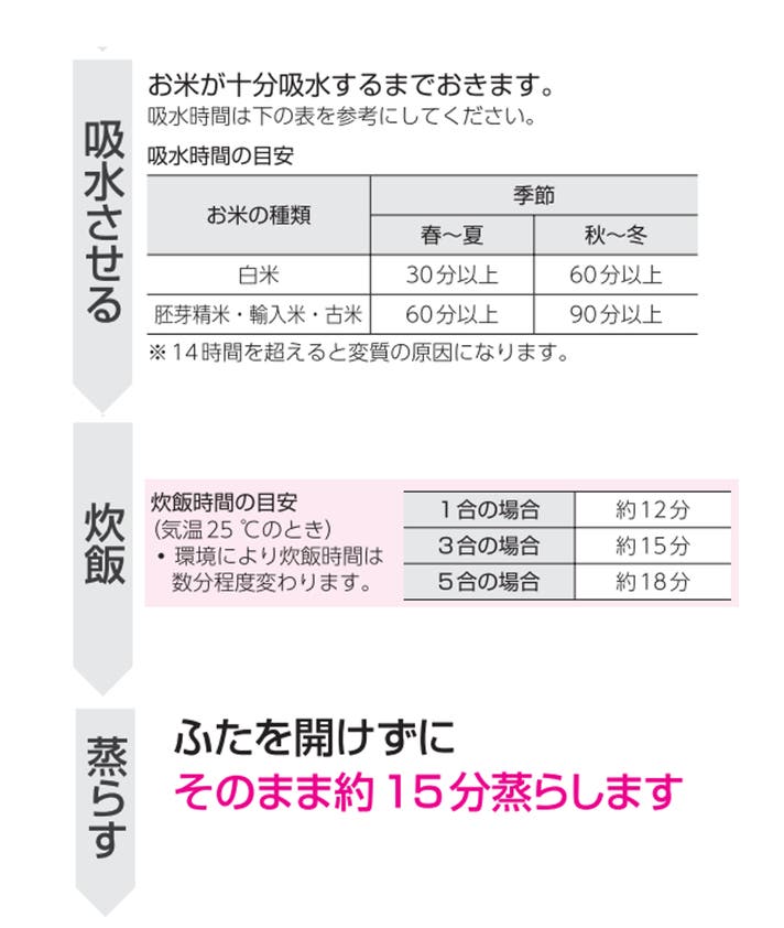 ※低温下(10℃以下)ではガスが気化しにくく十分な火力が得られないため、正常に炊き上がらない場合があります。