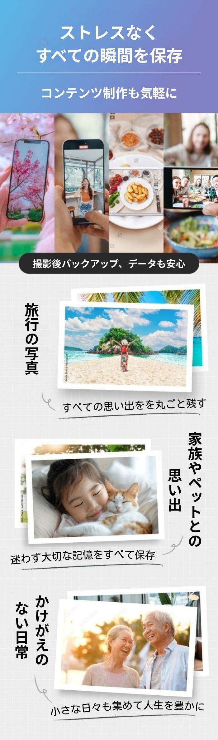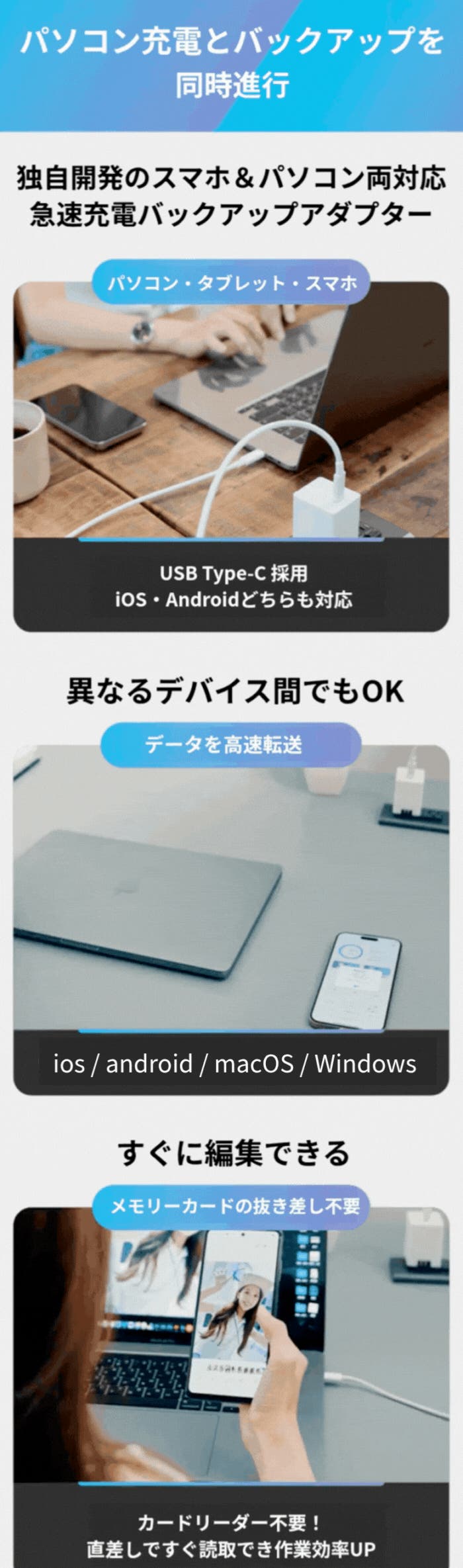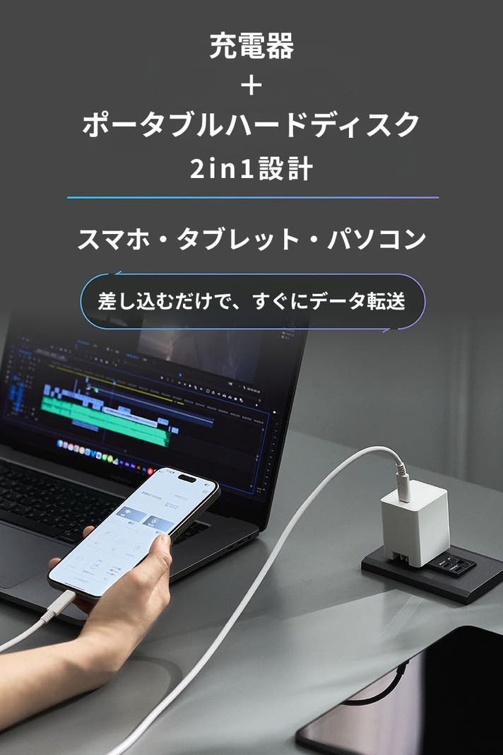 - 進化したGaN技術で高速充電&自動バックアップ。便利な2in1設計で、記憶をまるごと預けよう。