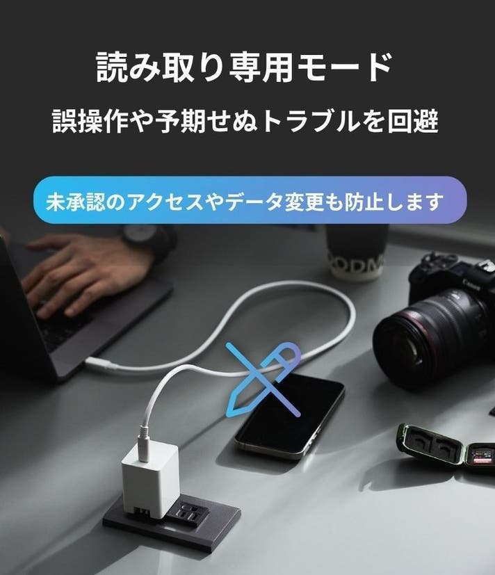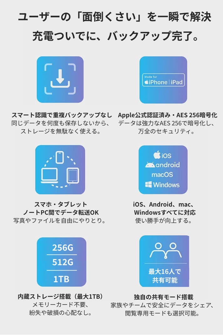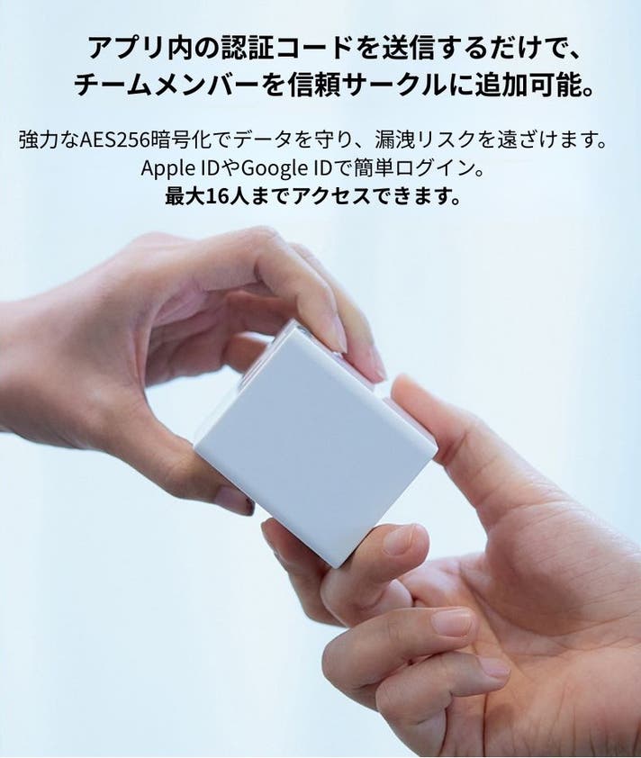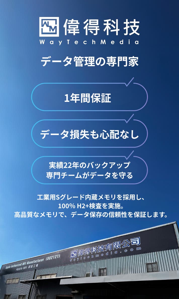 - Apple正規認証・高度なAES 256暗号化。大容量ストレージ内蔵でメモリーカード不要。