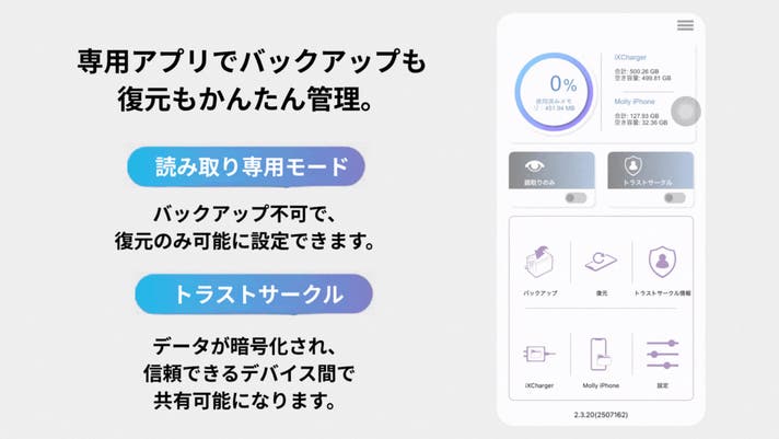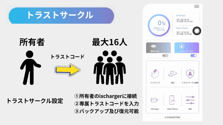 ②「トラストサークル」は最大16人まで登録可能で、各ユーザーが所有者のixchargerに接続し、専用のパスコードを入力することで、データのバックアップおよび復元が可能となります。