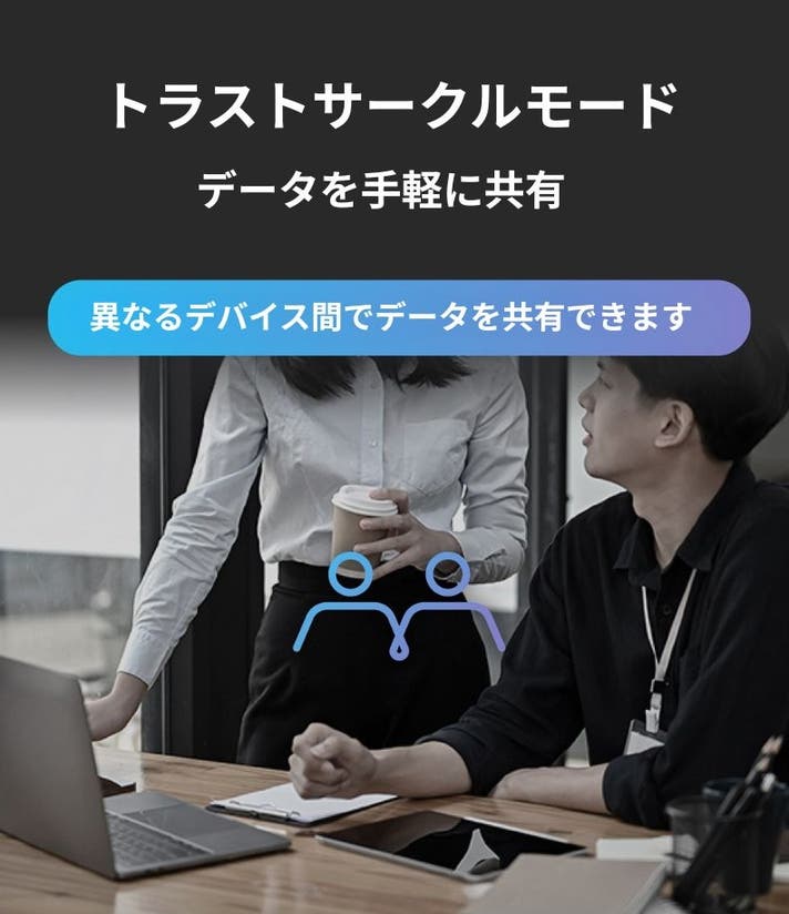 - マルチデバイスでOSの壁を越えてデータ同期。信頼サークルモードで最大16人まで共用可能。