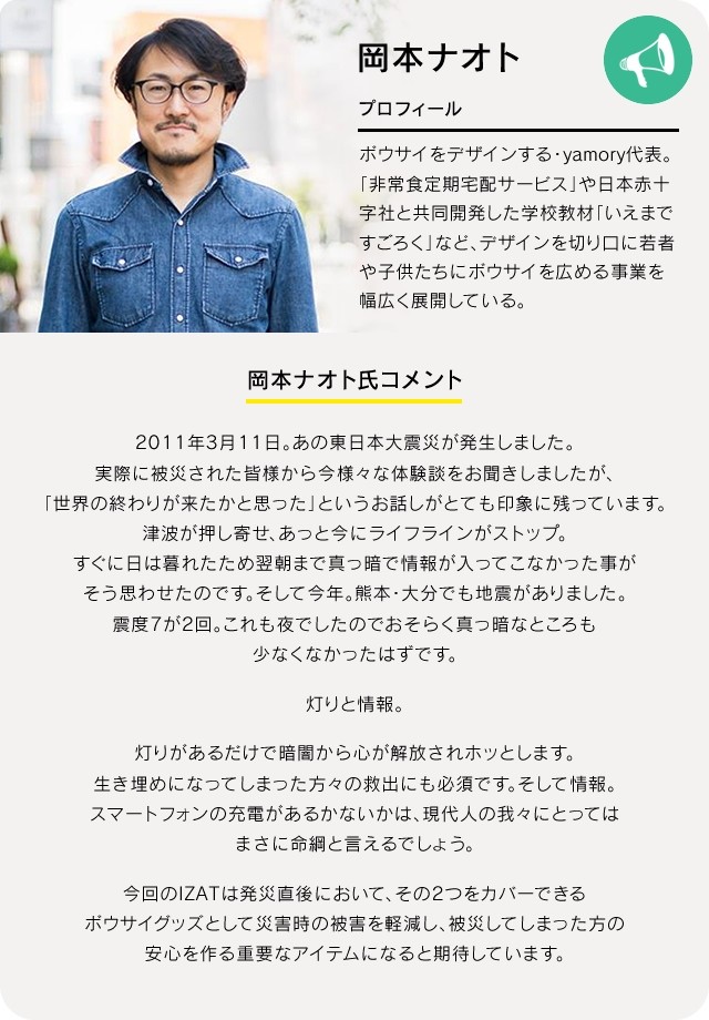 そんな思いをこの災害時用LEDライト兼モバイルバッテリー「IZAT」(イザット)に込めています。