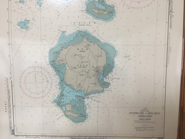 ダイビングポイント開発はまず伊是名島の海図を見ながら、どこに潜るかを決めていきます。