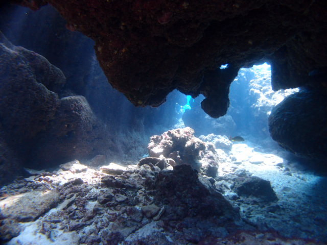 ○水中洞窟...リーフの外が小さなドロップオフになっている伊是名島には洞窟がいっぱいあります。光の入り方や洞窟の長さなど、ダイビングポイントとして最適な洞窟を探しましょう!