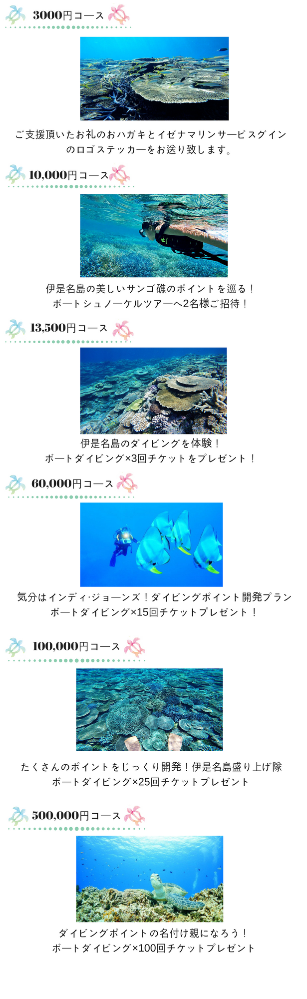 各コースのリターンには、ご支援頂いた皆様が伊是名島の海を楽しんで頂けるものをご用意しております。