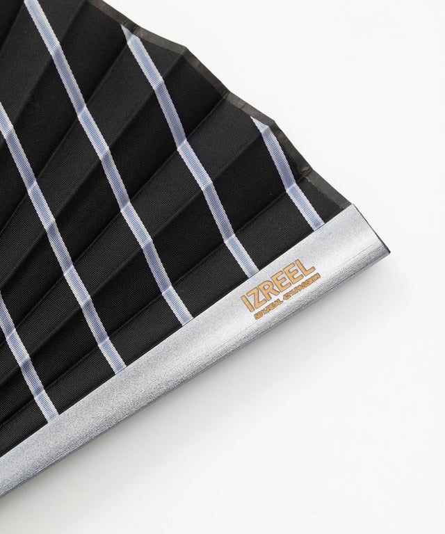 この扇子の特長は、独自開発したジャカード生地です。緻密にして繊細な柄を表現しております。すべての素材は、ネクタイを作製するコンピュータジャカード機を使用しているため、一見シンプルな柄でも他にない光沢感があります。扇骨はメタリック塗装を施し、ハイテクな雰囲気も持ち合わせています。