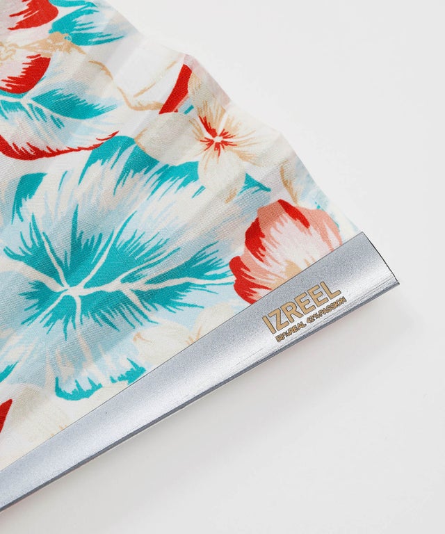 ここからは、こだわり素材のご説明をさせていただきます。このジャカード生地は、ネクタイを作製する機械を使用しているため、非常に緻密で繊細な柄が表現できます。また通常ネクタイ専用の生地工場のため、生地として供給することをしておらず、特別にIZREELに対して、生産していただいております。ひとつひとつの柄のデザインも図案や配色を徹底的に繰り返し、完成させております。まさにブランドとしての生命線であり、他にない、唯一無二の企画といえます。生産地は海外になりますが、実は国内ジャカード産地の工場では再現不可能な技術であると言われたことがありました。最高の技術の結集が、日本の伝統的な『扇子』というアイテムになり、Tokyoのラグジュアリーなストリートカルチャーを背景に、世界に発信していこうとしております。