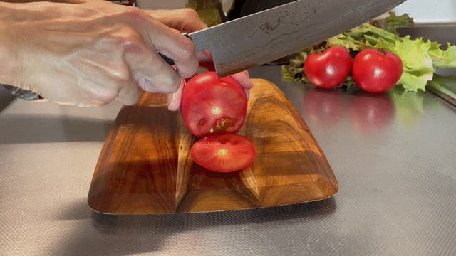 トマトを手で押さえなくてもスライスできるほどの切れ味。
