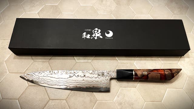 最近はレーザー刻印で見た目だけダマスカスに似せた安価の包丁も出回っていますが、IZUMIは正真正銘のダマスカス鋼を使用しています。