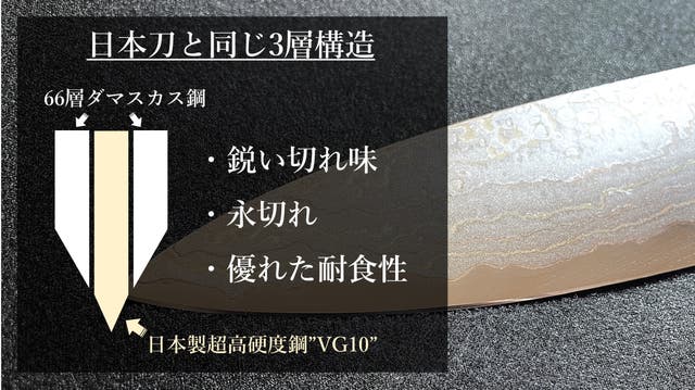 芯材を包むダマスカス鋼は柔軟性に優れ、刃にかかる負荷を分散することで強靭製、耐久性を向上させます。