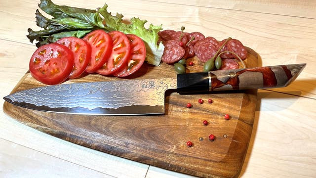 そんな中、海外の展示会でレジンと天然木を組み合わせたハイブリッド素材と出会い、この素材でハンドルを作れば銅含有ダマスカスの刃にもマッチするのではと思い、採用しました。