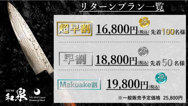 IZUMIの製作は、刃部分はハンドル部分など各パーツ事に複数の工房と協力しながら進めております。 流行病に関係する社会情勢、国際情勢の影響や、天候、天災、量産状況によりお届けが遅れる可能性がございます。万が一このような変更がある場合は、早急に活動レポートなどで情報の共有をさせて頂く予定でございます。 また、ご購入の数が想定を上回った場合、製造工程上の都合等により出荷時期が遅れる場合がございます。 2.ご購入後のキャンセルについて IZUMIはすべて、お申込み頂いてから職人が一つ一つ丁寧に製作しております。そのため、応援購入後のサポーター様都合、使用感等によるキャンセルや返⾦はお受け出来ませんのでご了承下さい。 3.通常販売予定価格について 本プロジェクトを通して想定を上回る皆様からご購入を頂き、現在進めている環境から量産体制を更に整えることができた場合、正規販売価格が販売予定価格より下がる可能性もございます。 4.本文中に記載させていただいたスケジュールは、あくまでプロジェクト公開時点の予定です。応援購入の性質上、配送遅延のおそれがございます。原則として、配送遅延に伴う応援購入のキャンセルはできませんが、リターン配送予定月から3ヶ月を超えた場合には、希望者に限りキャンセルにて対応させていただきます。 最後に、IZUMIを手に取ってくださった皆様に喜んで頂けるよう、チーム一丸となって誠心誠意取り組んでまいります。ご購入のほど何卒よろしくお願い申し上げます。