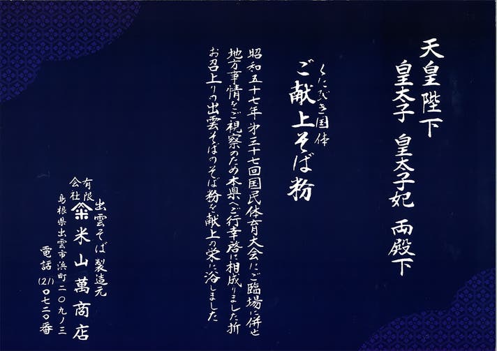 - 高級出雲蕎麦として天皇陛下にそば粉献上の実績有り。