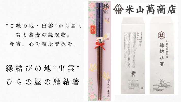 あわせて、「縁結びの地・出雲」ならではの縁起物ひらの屋さんの【縁結箸】もお付けしたセットもご用意いたします。出雲とのつながりを、特別感を感じていただけるようにいたしました。