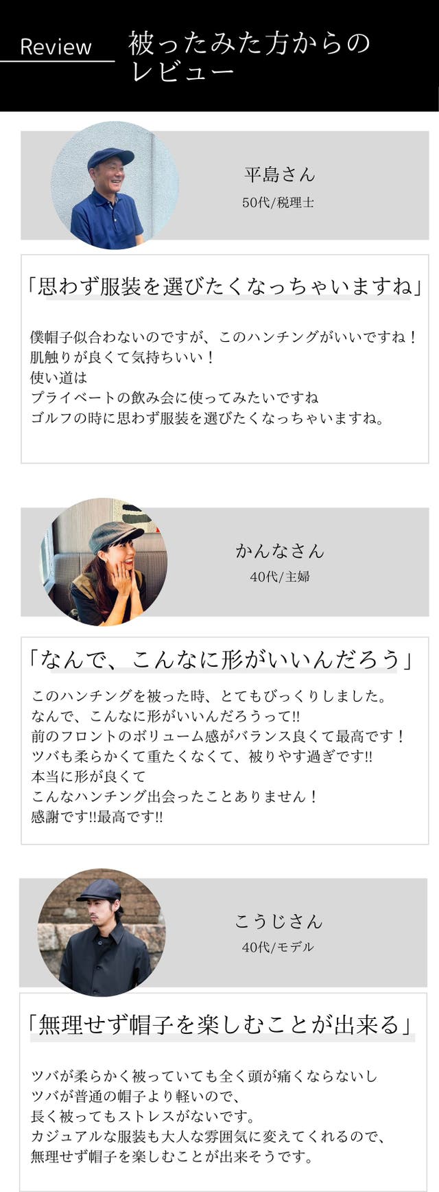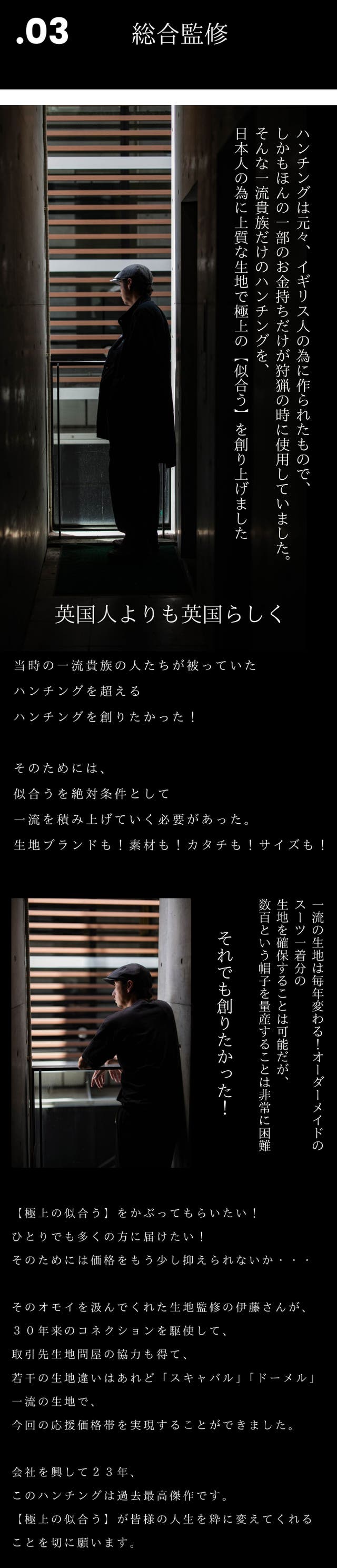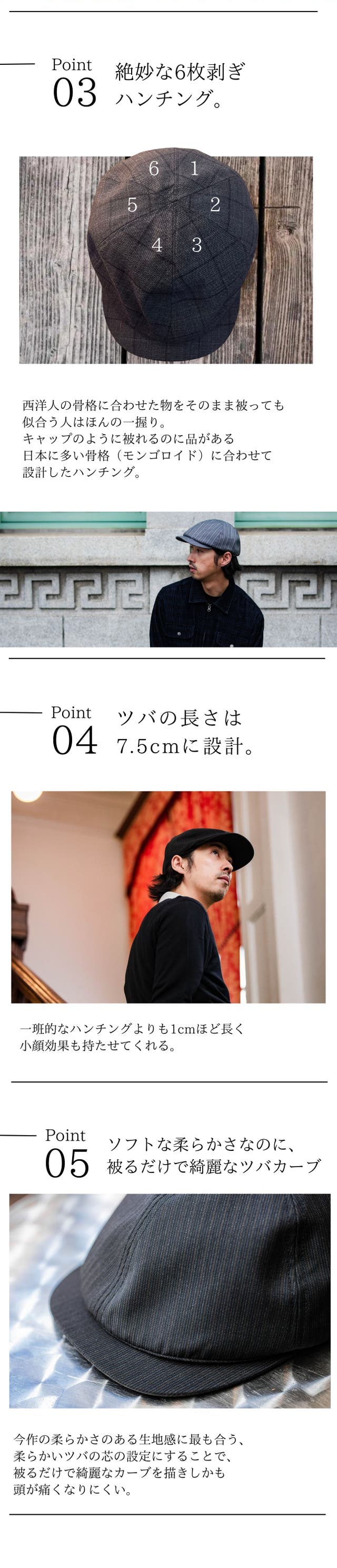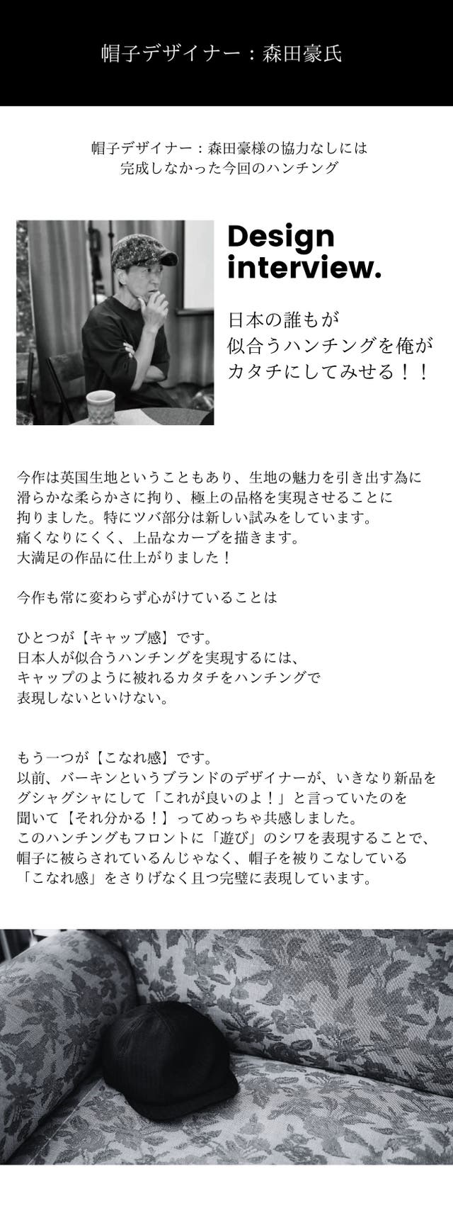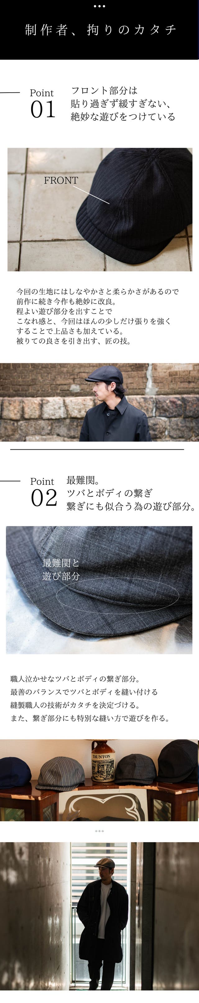 ハンチングは正直今でも私自身あまり被ることがありません。似合うカタチが本当に世の中に少ないからです。ただ1つ被っていたのが、今回のハンチングの初代モデルになります。発売がされなくなってからは、またハンチング離れが進んでしまいましたが今回を期に皆様と一緒にハンチングを被るという楽しみを味わえたらと考えております。本当に【こなれ感】がでる凄くいいハンチングですので皆様にも楽しんでもらえる自信があります!